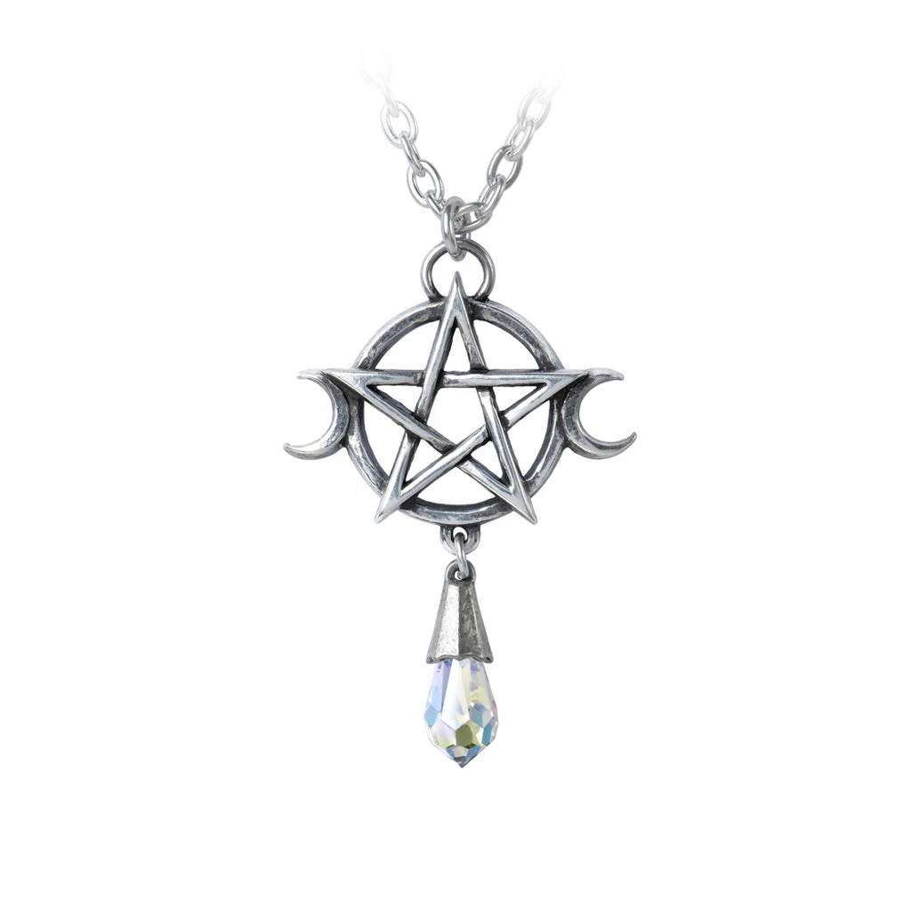 Combining the empowering pentagram of the five elements, (fire, water, earth, air and spirit), with the three moon phases of Wicca’s Triple Goddess, balanced with a crystal to focus your magickal energies.
