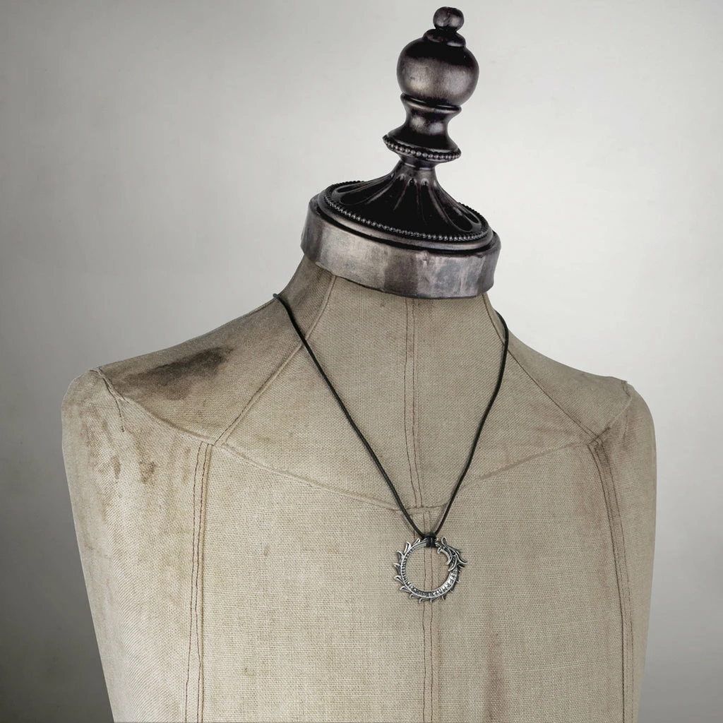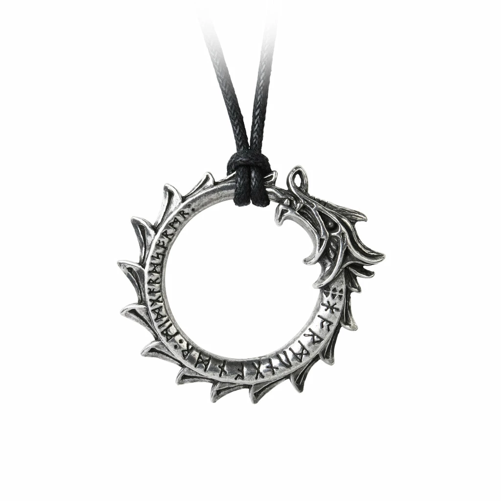 An antiqued pewter pendant, Viking-style serpent-dragon biting it’s own tail, making the form of a ring, and engraved on the front in runic and on the reverse with the serpent’s names.