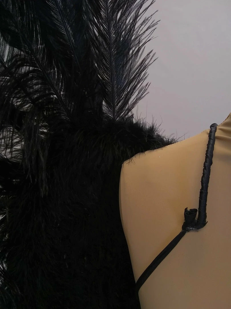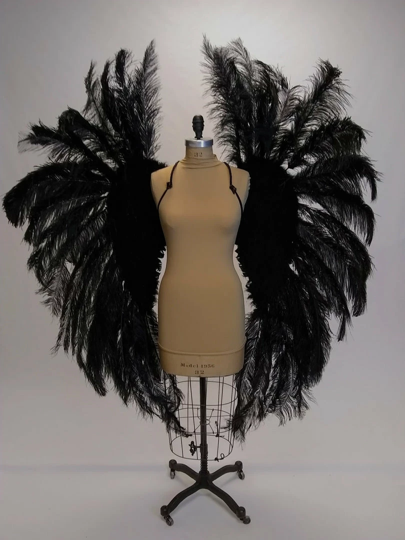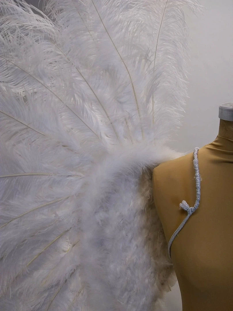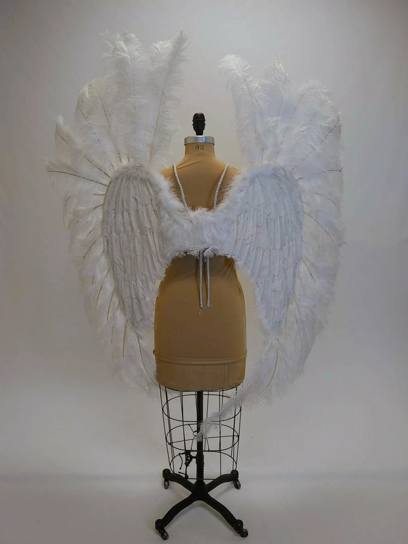 Ostrich feather angel wings with wire harness for easy wear. The base wing is covered with turkey and marabou feathers and framed with extra long ostrich feathers. The base wing measures about 30″ wide by 22″ long and the overall wings are about 65″ x 65″. Because this is a natural product there may be some variation in overall dimension and shape.