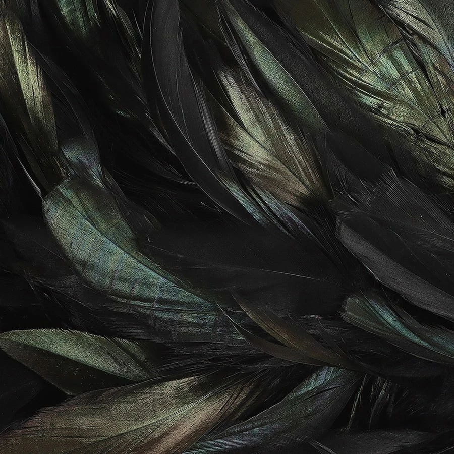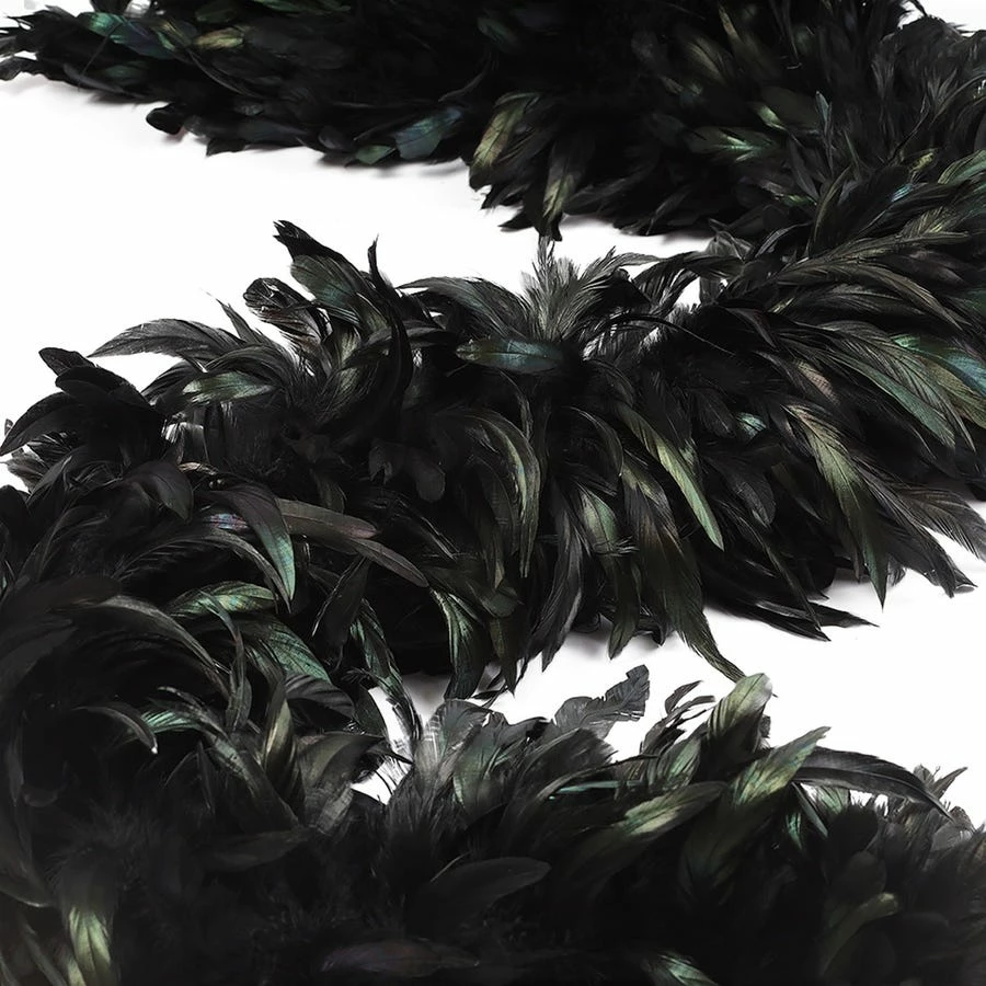 This full and fluffy rooster coque feather boa is an iridescent black that gives off an emerald shimmer. It is sewn with wire to prevent shedding and unraveling.