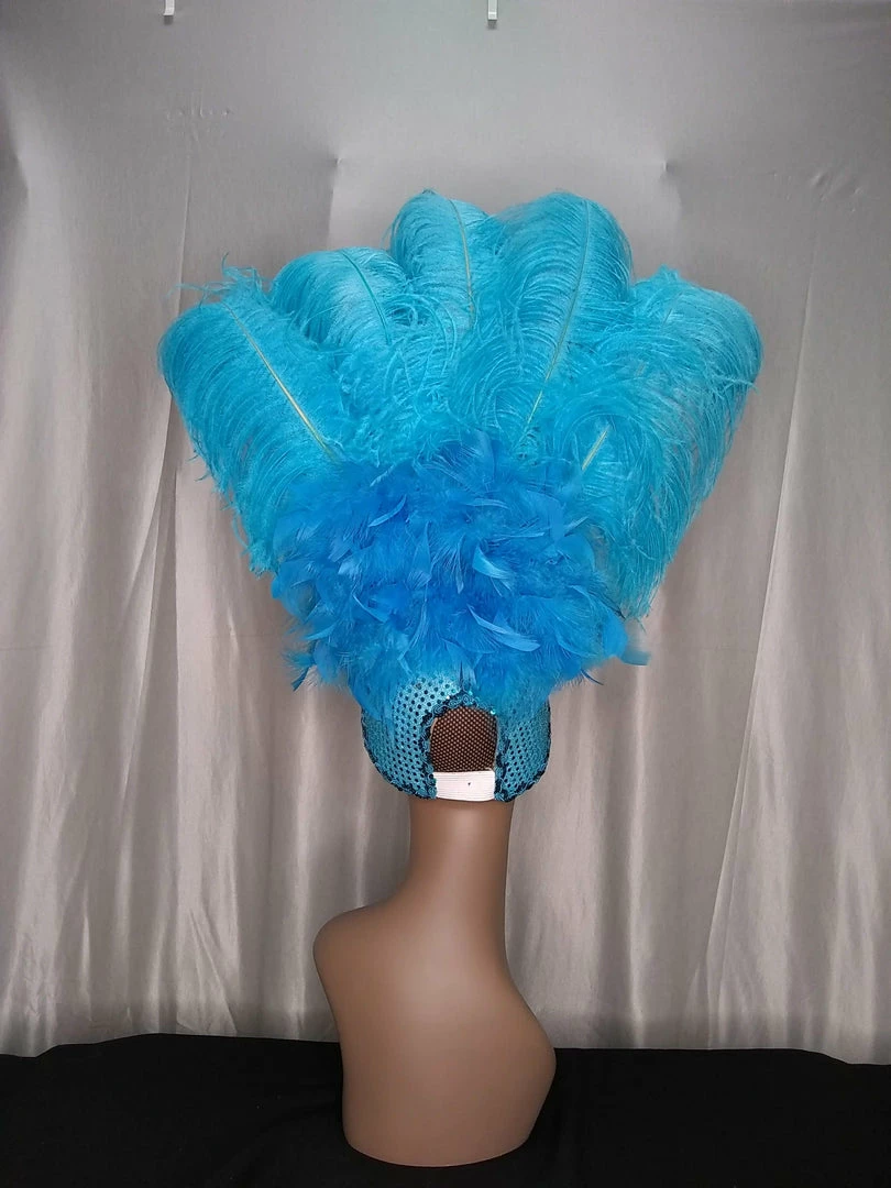 Feather headpiece with structured cap, attached sequin trim and gemstones, and extra large ostrich feathers in turquoise. The back of the cap has elastic to fit a range of head sizes, and there is an elastic strap under the chin to secure.