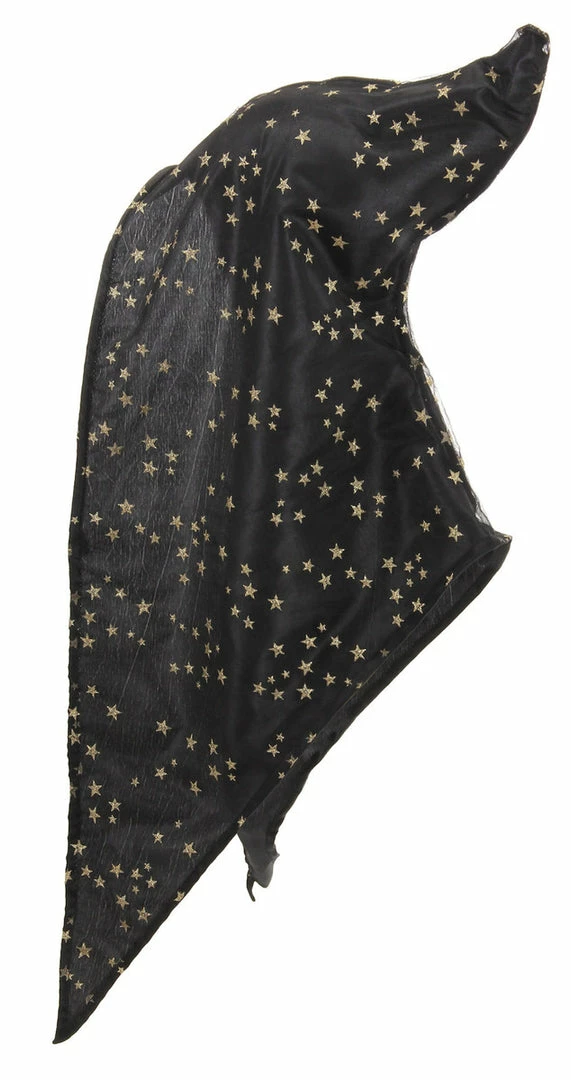 Easy to wear, and designed to fit most wizards, this hood creates a dramatic silhouette as it tapers to a point high over your head. The constellation of star detailing on black taffeta and an inside of silky onyx fabric make this piece worthy of any dark sorcerer. Finishing off this fantastical hood is the fully adjustable wire edge which allows transformations into a variety of shapes and looks.