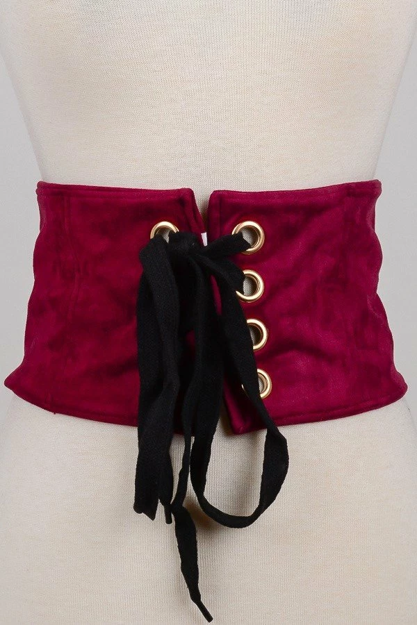 Lace-up faux suede belt. Stretches Up To Approx. 36″ Around Waist