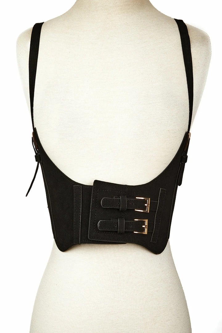 Snap front black velvet belt with buckles and adjustable suspender straps. One Size Fits Most.
