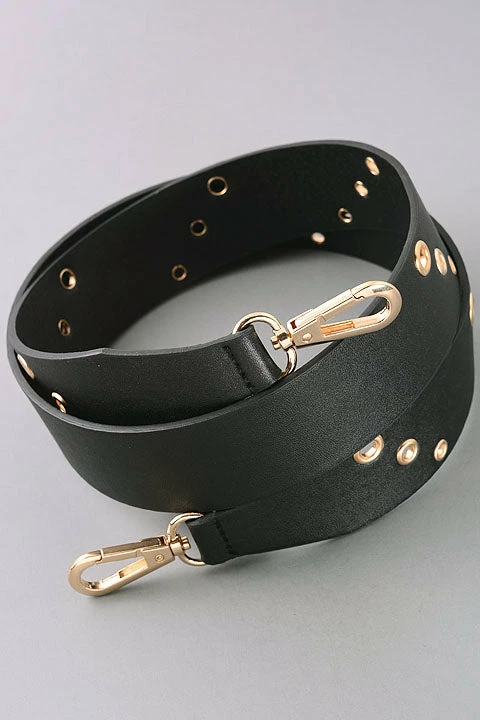 Black pleather belt strap with gold grommets and clasps. Can be worn as a bandolier, belt, or used to replace an existing purse strap.