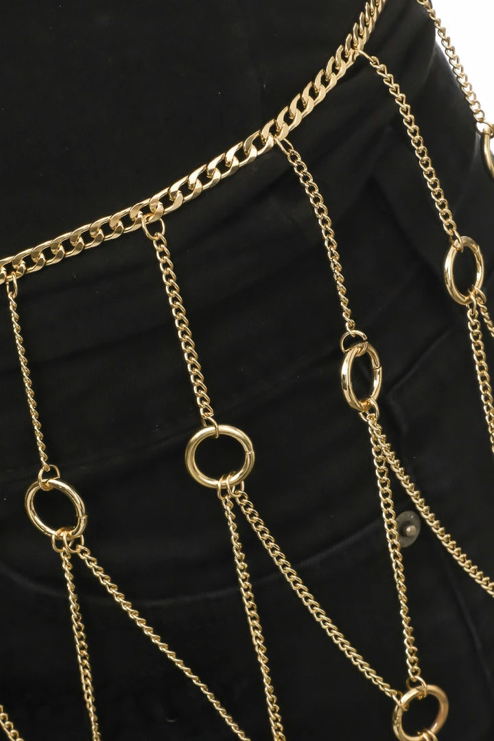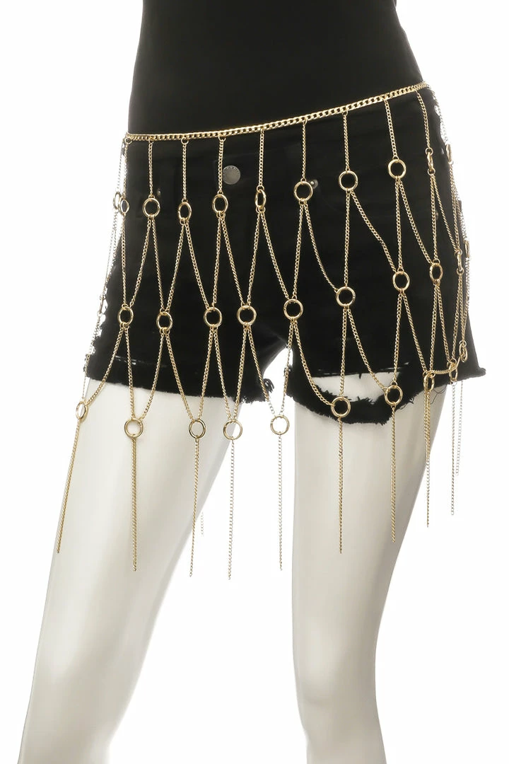Gold chain belt with hanging rings and chain fringe. Adjustable clasp in the back,