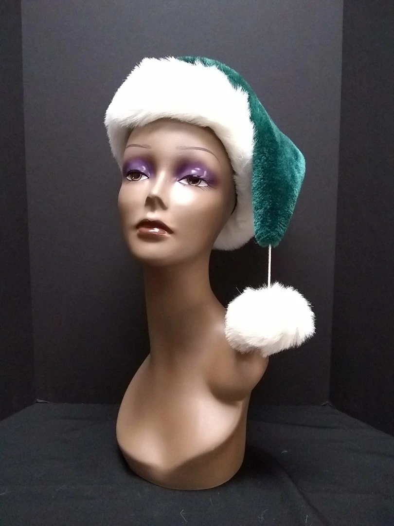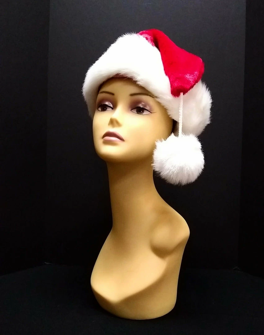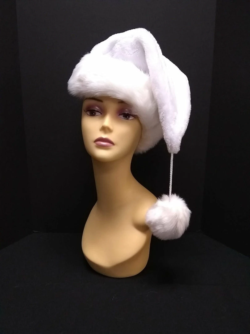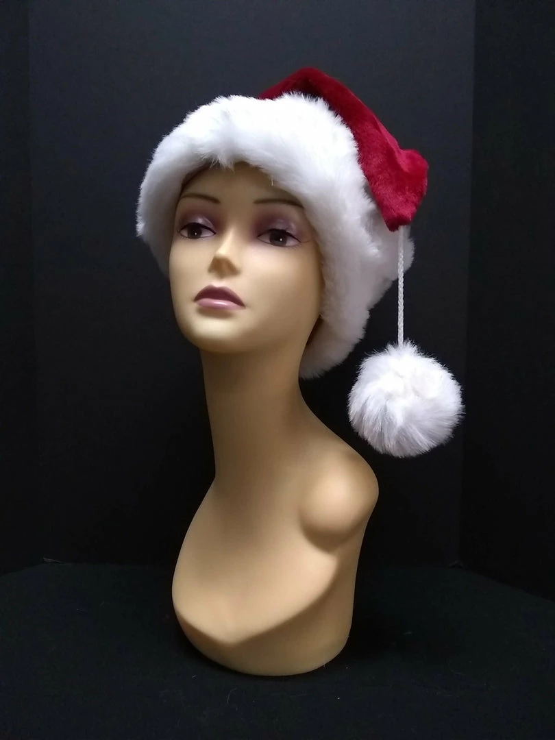 Plush fur Santa hat with long white fur band and string pom-pom.