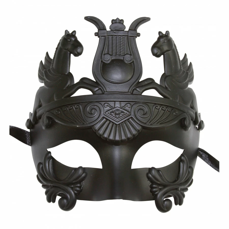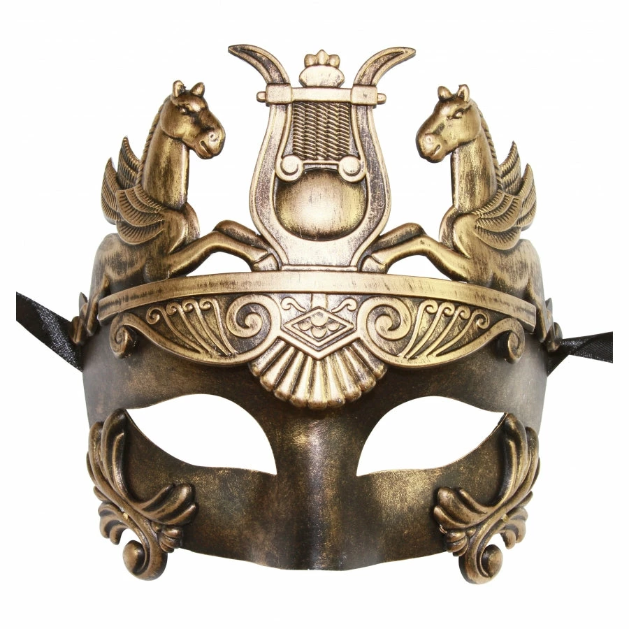 Gladiator style masquerade mask with horse and filigree adornment and ribbon ties to secure.