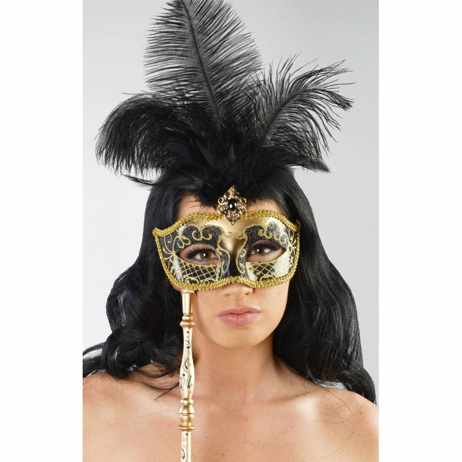 Black and gold hand-held carnival masquerade mask with glitter and feathers.