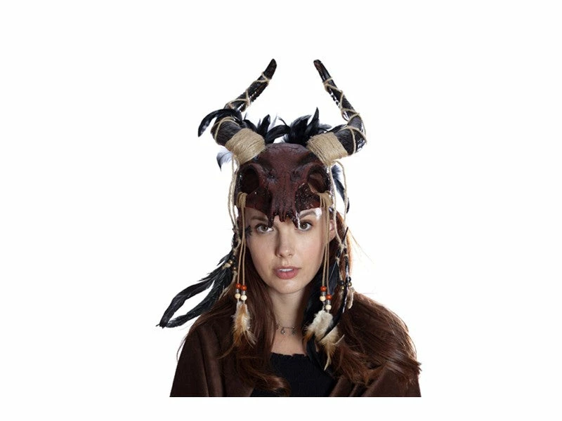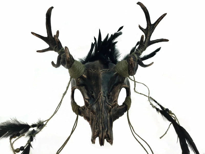 Metallic ancestral demon mask with twine wrapped horns and black feathers. Elastic to secure.