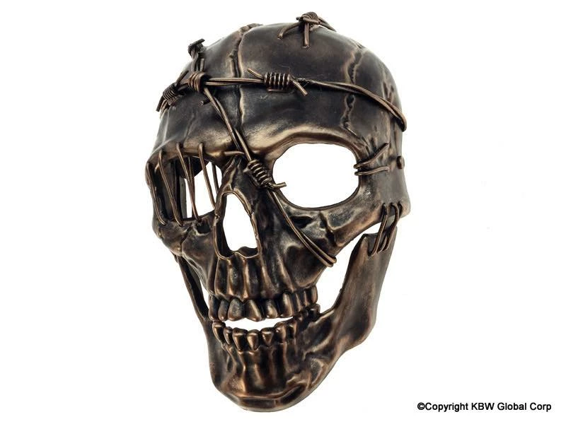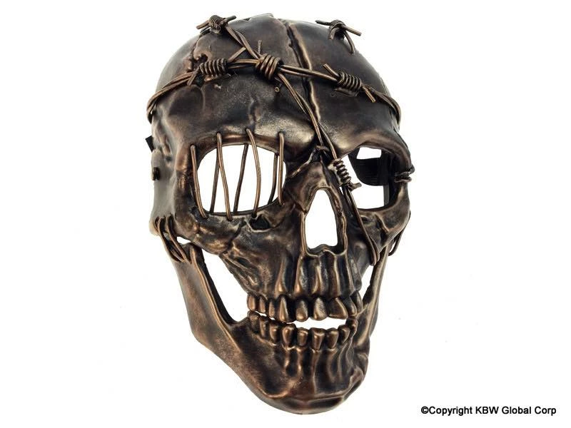 Skeleton mask with barbed wire and “stitched” eye socket. Elastic to secure.