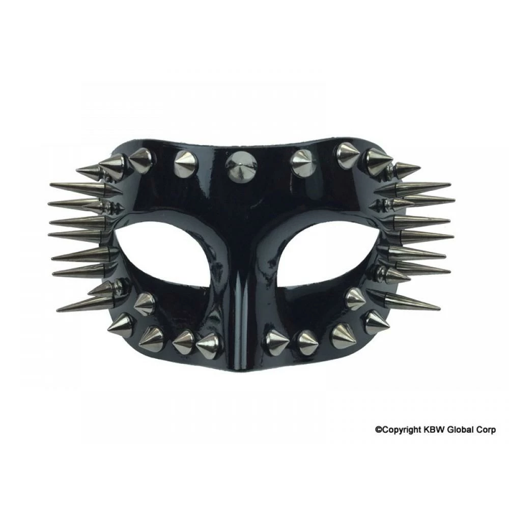 Gloss finish mask with spikes of assorted length. Ribbon ties to secure.