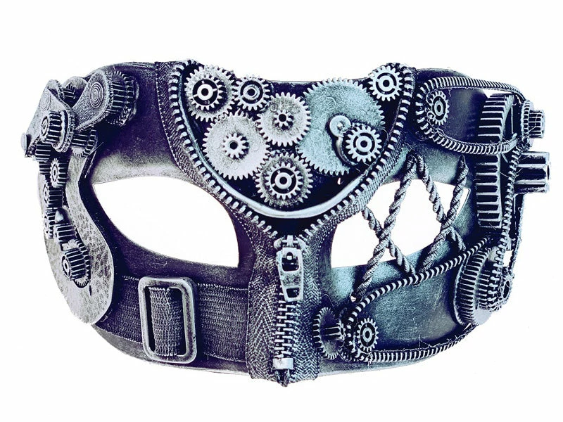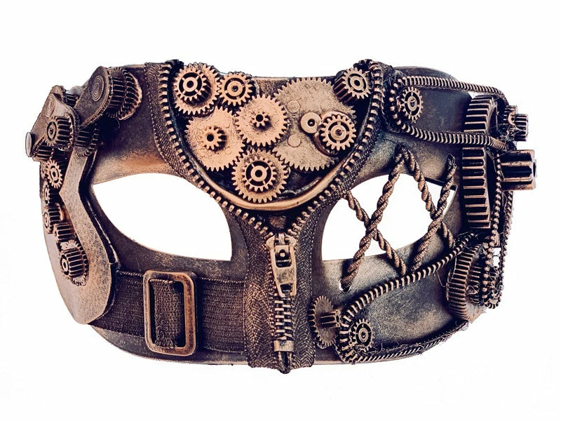 Steampunk mask with attached gears, zipper, and robe stitching. Ribbon ties to secure.