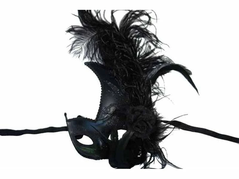 Venetian mask with swan motif, glitter swirl detail, and feather with faux flower on the side. Ribbon ties to secure.