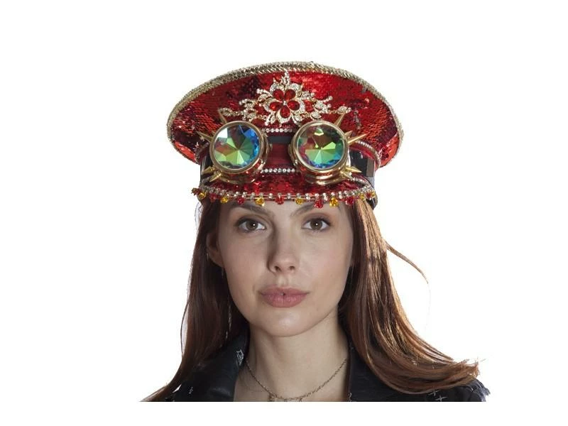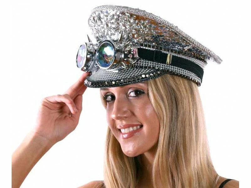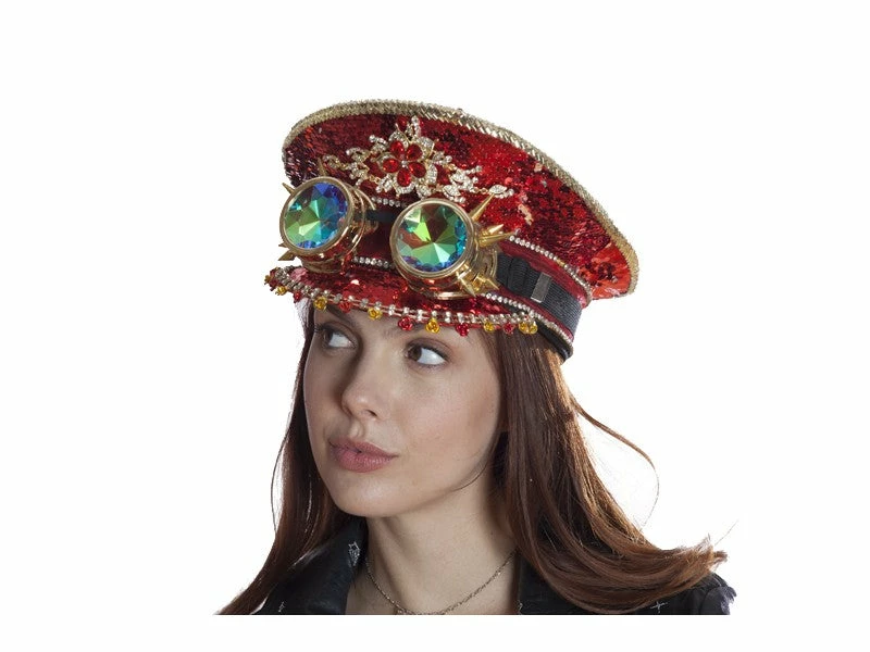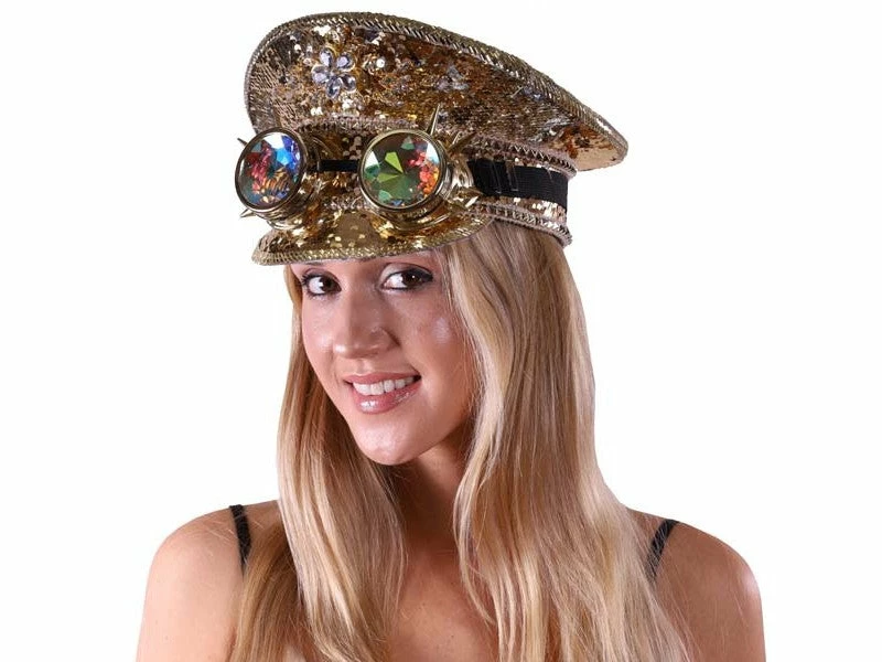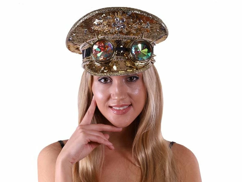 Sequin peaked cap with gemstone trim, center crystal flower ornament and gemstone trim. Includes attached kaleidoscope goggles with spikes.