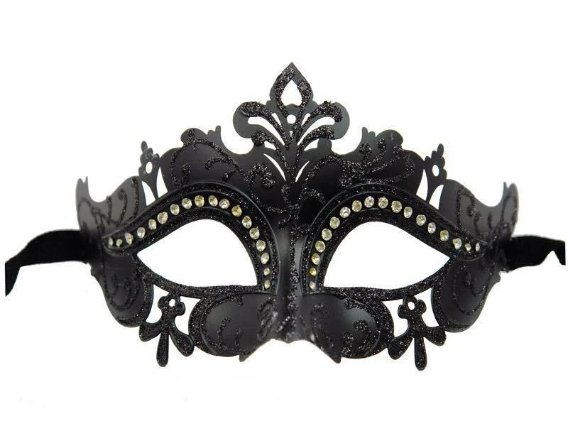 Venetian mask with cutouts, glitter detail, and crystals over the brow. Ribbon ties to secure. Offered in Black, Gold and White.