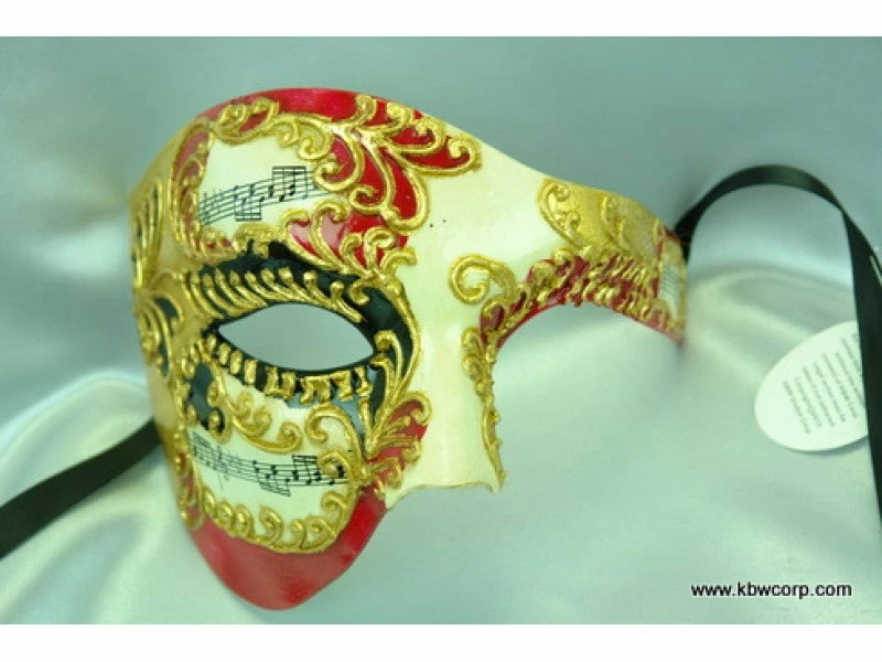 Includes phantom style mask with music note detail, gold outlines and ribbon ties to secure.