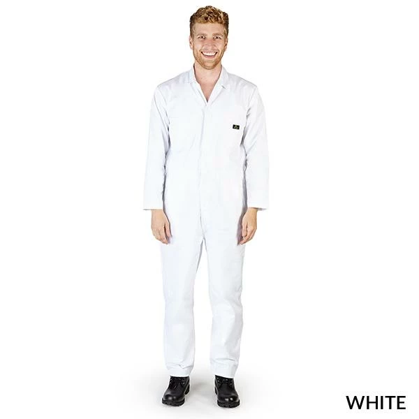 Men’s long sleeve coverall has 2 side pockets, 2 chest pockets, and 2 back pockets with lapel collar. Heavy duty upper body zipper with snap button closure. Elastic waist area. 31″ pants inseam.