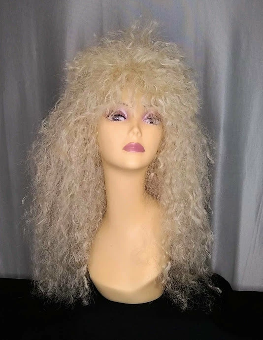 Crimped rocker style wig in black or blonde. Unisex sizing, synthetic fiber.