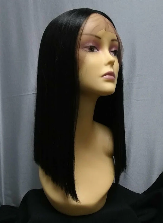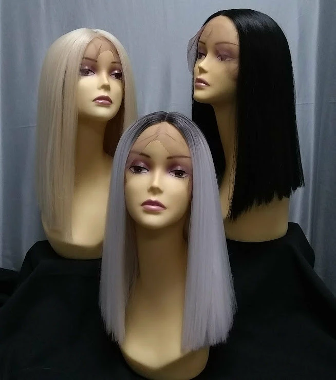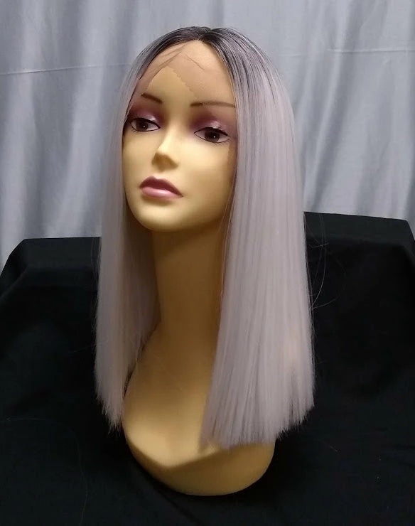 Human hair blend wig cut in a blunt bob. Lacefront. Heat safe. Colors: natural black 1B, silver ombre, blonde