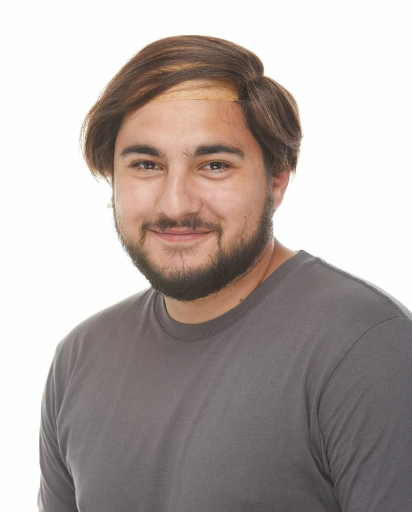Partial “bald” wig cap with comb over styled hair. Synthetic, not heat safe for styling.
