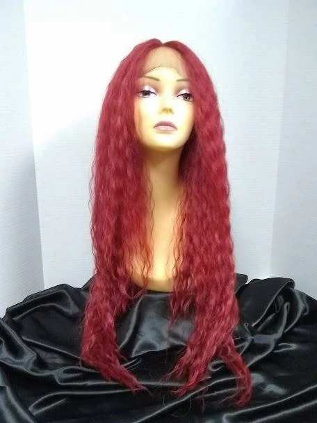 Long and wavy heat safe synthetic fiber wig with deep 5″ center part.