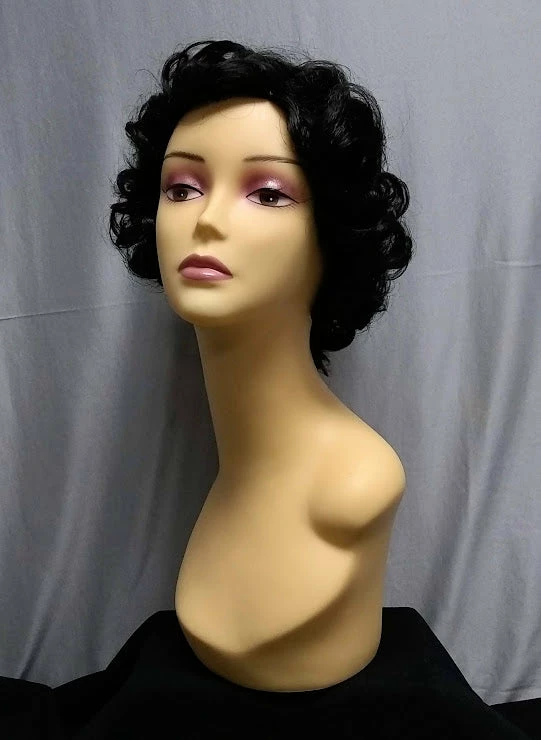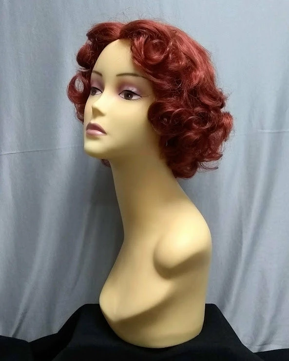 Fun short curls in a parted wig that can be worn centered or to the side. Synthetic, not heat safe. Colors: blonde, black and auburn