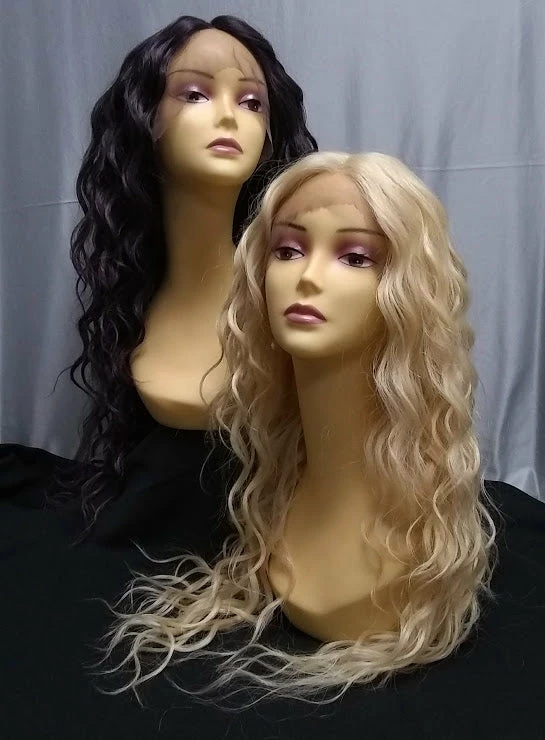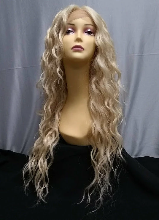Long and wavy, tapered in the back. Heat safe synthetic fibers, lace front center part.