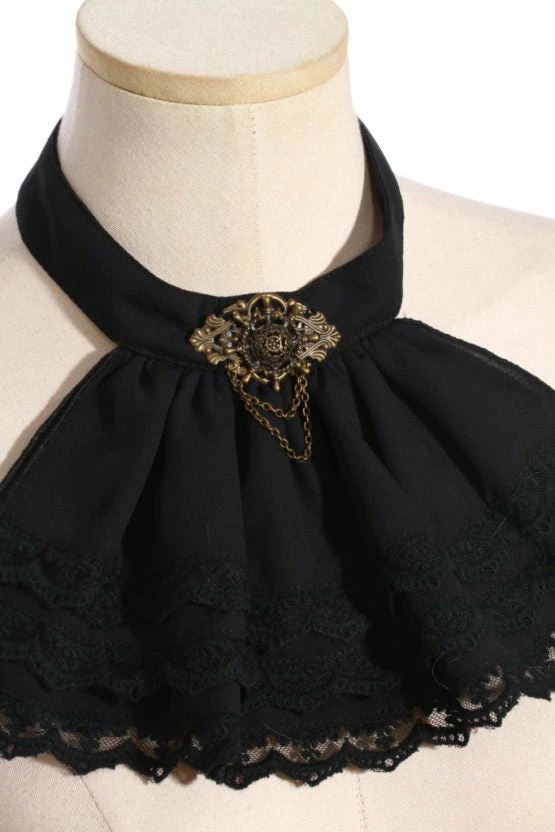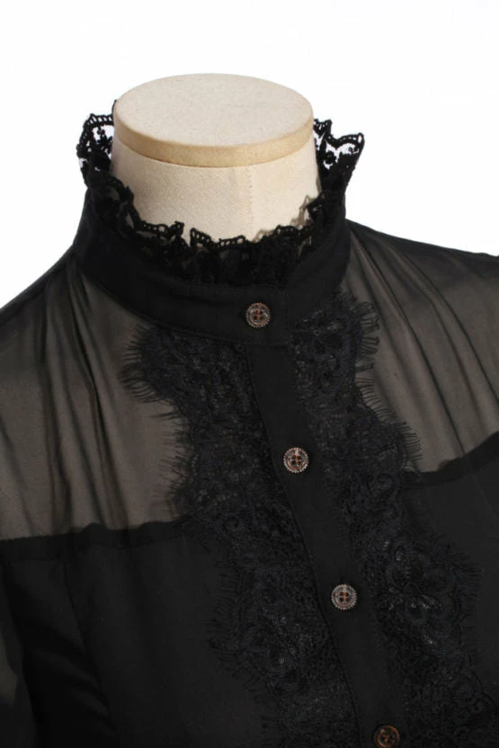 Black see through sleeve shirt with steampunk gear button front closure and detachable jabot. Shirts laces in the back for a customized fid and has elastic at the wrist.