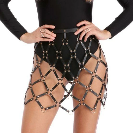Black leatherette crisscross skirt with adjustable buckles at back.